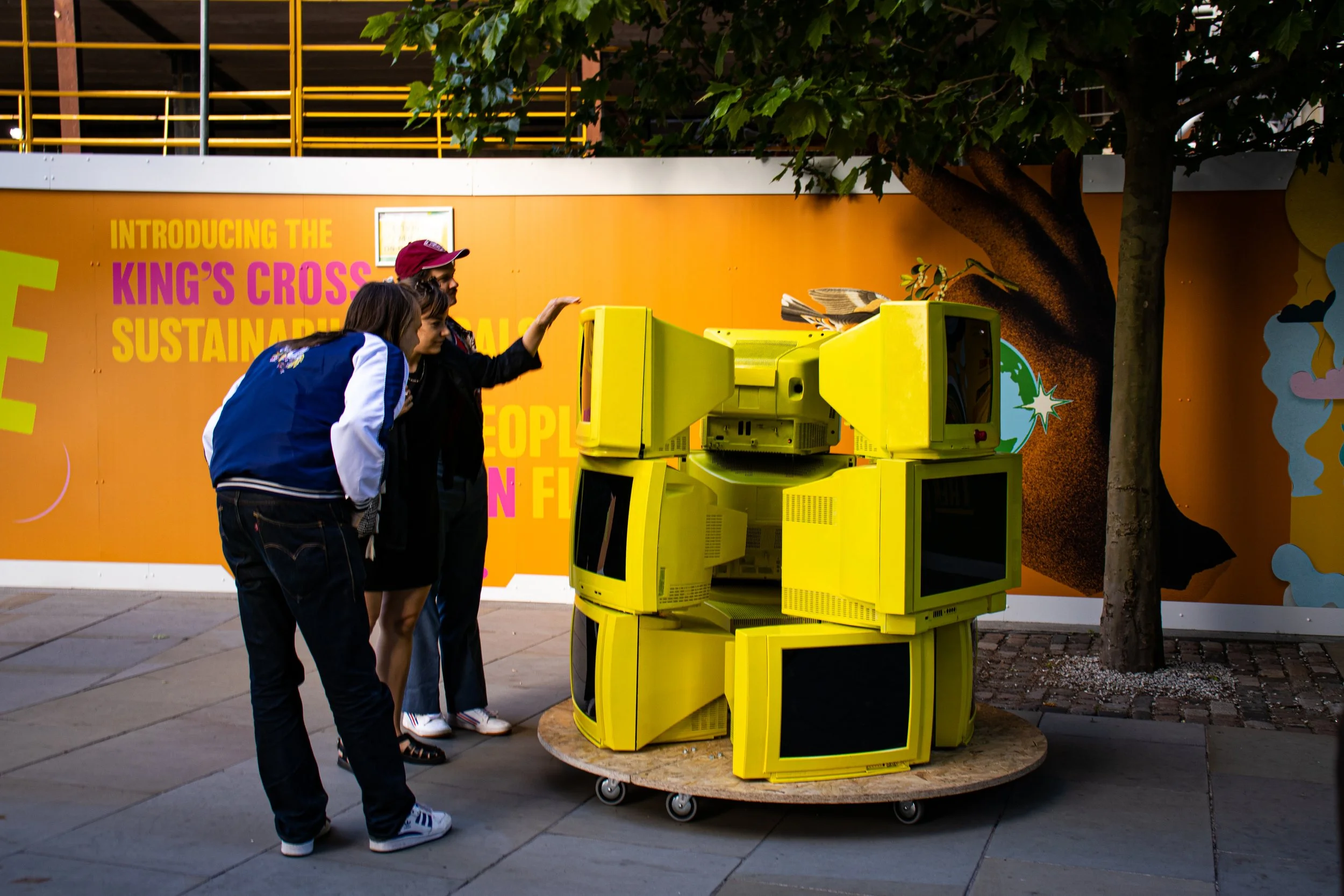 This Interactive installation explores the many ways innovation can be interpreted and understood by people. The stack of TVs represents a view into this world – with each interaction representing a different type of innovation. This piece also articulates how the new site has become a space for innovation in material, social and technological contexts.